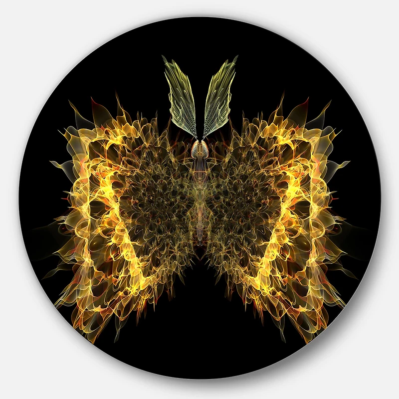 Bring Contemporary Abstraction to your home with this Yellow Circle metal wall art. Available in several sizes, this Golden Fractal Butterfly in Dark Metal Artwork makes it the focal point of any room or office. Features:Style: Modern & Contemporary Subject: Floral, Landscapes, Country Charm Color: Yellow White Gloss Coating ensures colors are extra vibrant with light reflection Unique Metal Wall Decor with Aluminum grade sheet metal 1-inch mounting frame gives the illusion of artwork floating on the wall Mounting brackets and instructions are included High quality digital images are created directly into a glossy aluminum panel, producing a stunning and captivating print in the glossy finish of the metal Water, fire, and scratch resistant HD aluminum panels Looks better than any photo paper and guaranteed to last at least 20 years Easy to clean with a microfiber cloth Colors are far superior to regular canvas art Fade resistant Water resistant UV-coated finsih Frameless Hangers on back Easy to hang See Options for available sizes