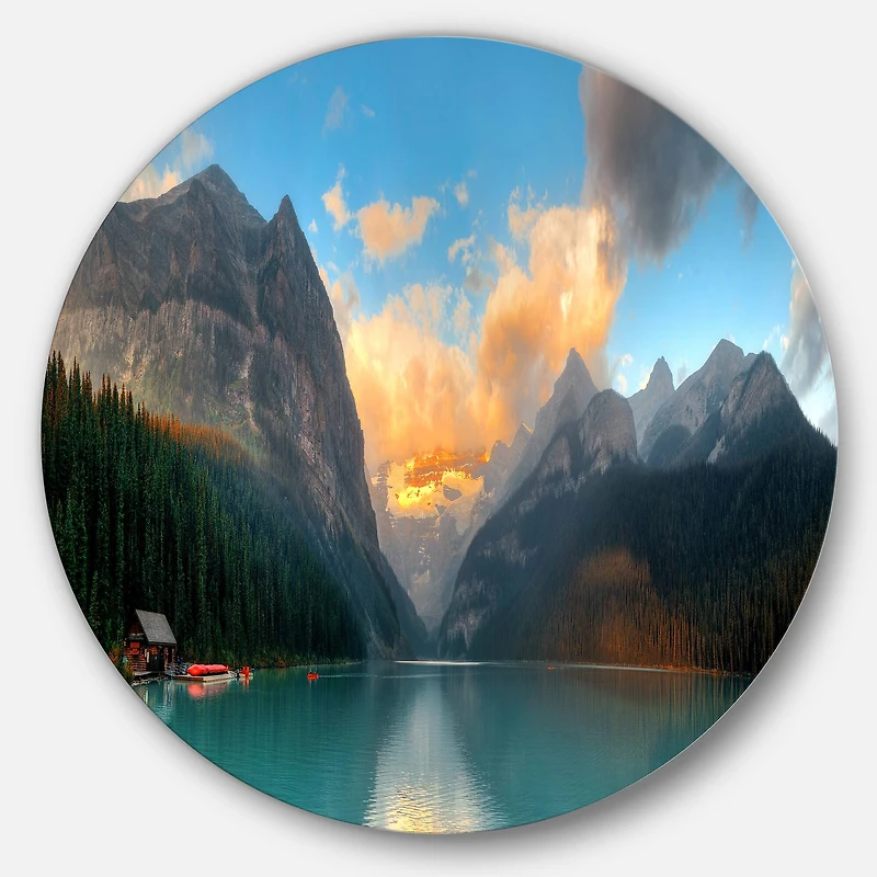Bring Contemporary Abstraction to your home with this Multi-Color Circle metal wall art. Available in several sizes, this Lake Louise Sunrise Banff Park Metal Artwork makes it the focal point of any room or office. Features:Style: Nautical & Coastal Subject: Landscapes, Country Charm, photography Color: Multi-Color White Gloss Coating ensures colors are extra vibrant with light reflection Unique Metal Wall Decor with Aluminum grade sheet metal 1-inch mounting frame gives the illusion of artwork floating on the wall Mounting brackets and instructions are included High quality digital images are created directly into a glossy aluminum panel, producing a stunning and captivating print in the glossy finish of the metal Water, fire, and scratch resistant HD aluminum panels Looks better than any photo paper and guaranteed to last at least 20 years Easy to clean with a microfiber cloth Colors are far superior to regular canvas art Fade resistant Water resistant UV-coated finsih Frameless Hangers on back Easy to hang See Options for available sizes