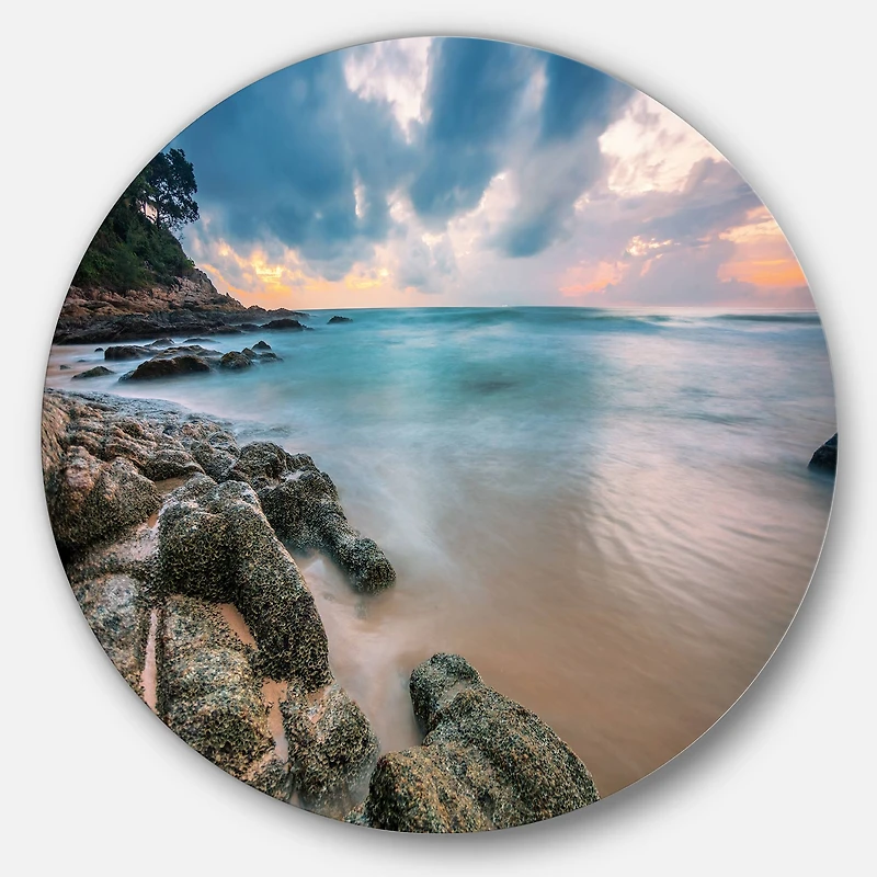 Bring Contemporary Abstraction to your home with this Blue Circle metal wall art. Available in several sizes, this Gloomy Tropical Sunset Beach Metal Artwork makes it the focal point of any room or office. Features:Style: Nautical & Coastal Subject: Sea & Shore, Nautical, Landscapes Color: Blue White Gloss Coating ensures colors are extra vibrant with light reflection Unique Metal Wall Decor with Aluminum grade sheet metal 1-inch mounting frame gives the illusion of artwork floating on the wall Mounting brackets and instructions are included High quality digital images are created directly into a glossy aluminum panel, producing a stunning and captivating print in the glossy finish of the metal Water, fire, and scratch resistant HD aluminum panels Looks better than any photo paper and guaranteed to last at least 20 years Easy to clean with a microfiber cloth Colors are far superior to regular canvas art Fade resistant Water resistant UV-coated finsih Frameless Hangers on back Easy to hang See Options for available sizes