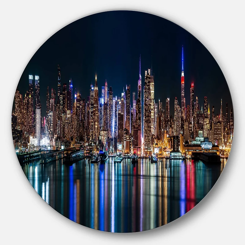 Bring Contemporary Abstraction to your home with this Blue Circle metal wall art. Available in several size, this New York Midtown Night Panorama Metal Artwork makes it the focal point of any room or office.Features:Style: IndustrialSubject: Architecture, Cityscapes, PhotographyColor: BlueWhite Gloss Coating ensures colors are extra vibrant with light reflectionUnique Metal Wall Decor with Aluminum grade sheet metal1-inch mounting frame gives the illusion of artwork floating on the wallMounting brackets and instructions are includedHigh quality digital images are created directly into a glossy aluminum panel, producing a stunning and captivating print in the glossy finish of the metalWater, fire, and scratch resistant HD aluminum panelsLooks better than any photo paper and guaranteed to last at least 20 yearsEasy to clean with a microfiber clothColors are far superior to regular canvas artFade resistantWater resistantUV-coated finsihFramelessHangers on backEasy to hangAvailable in multiple sizes