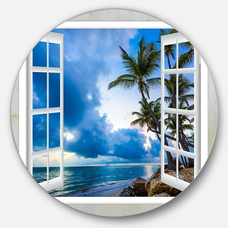 Bring Contemporary Abstraction to your home with this Blue Circle metal wall art. Available in several size, this Window Open to Cloudy Blue Sky Metal Artwork makes it the focal point of any room or office. High quality digital images are created directly into a glossy aluminum panel, producing a stunning and captivating print in the glossy finish of the metal.Features:Style: TropicalSubject: Landscapes, Country Charm, photographyColor: BlueWhite Gloss Coating ensures colors are extra vibrant with light reflectionUnique Metal Wall Decor with Aluminum grade sheet metal1-inch mounting frame gives the illusion of artwork floating on the wallMounting brackets and instructions are includedWater, fire, and scratch resistant HD aluminum panelsLooks better than any photo paper and guaranteed to last at least 20 yearsEasy to clean with a microfiber clothColors are far superior to regular canvas artFade resistantWater resistantUV-coated finsihFramelessHangers on backEasy to hangAvailable in multiple sizes