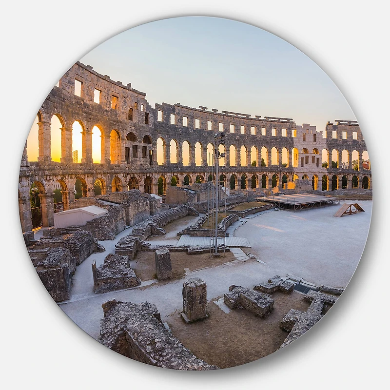 Bring Contemporary Abstraction to your home with this Blue Circle metal wall art. Available in several sizes, this Inside Ancient Roman Amphitheater Metal Artwork makes it the focal point of any room or office. Features:Style: Traditional Subject: Landscapes, Country Charm, photography Color: Blue White Gloss Coating ensures colors are extra vibrant with light reflection Unique Metal Wall Decor with Aluminum grade sheet metal 1-inch mounting frame gives the illusion of artwork floating on the wall Mounting brackets and instructions are included High quality digital images are created directly into a glossy aluminum panel, producing a stunning and captivating print in the glossy finish of the metal Water, fire, and scratch resistant HD aluminum panels Looks better than any photo paper and guaranteed to last at least 20 years Easy to clean with a microfiber cloth Colors are far superior to regular canvas art Fade resistant Water resistant UV-coated finsih Frameless Hangers on back Easy to hang See Options for available sizes