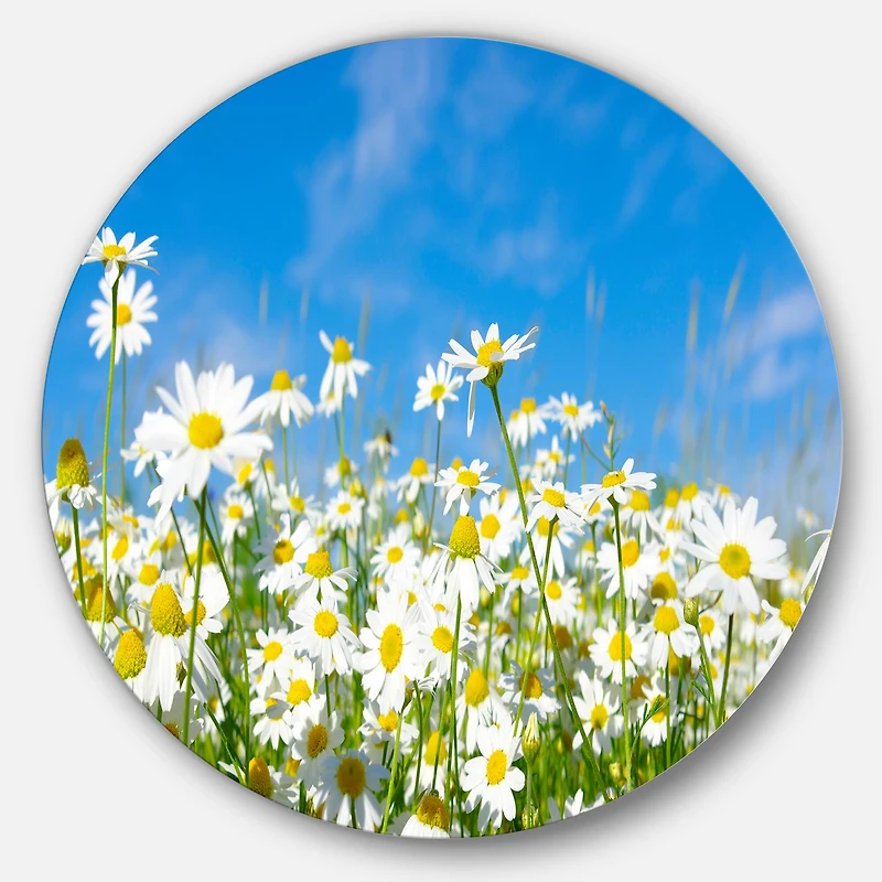 Bring Contemporary Abstraction to your home with this Blue Circle metal wall art. Available in several sizes, this White Daisies under Bright Blue Sky Metal Artwork makes it the focal point of any room or office. Features:Style: Floral Subject: Floral, Landscapes, Country Charm Color: Blue White Gloss Coating ensures colors are extra vibrant with light reflection Unique Metal Wall Decor with Aluminum grade sheet metal 1-inch mounting frame gives the illusion of artwork floating on the wall Mounting brackets and instructions are included High quality digital images are created directly into a glossy aluminum panel, producing a stunning and captivating print in the glossy finish of the metal Water, fire, and scratch resistant HD aluminum panels Looks better than any photo paper and guaranteed to last at least 20 years Easy to clean with a microfiber cloth Colors are far superior to regular canvas art Fade resistant Water resistant UV-coated finsih Frameless Hangers on back Easy to hang See Options for available sizes