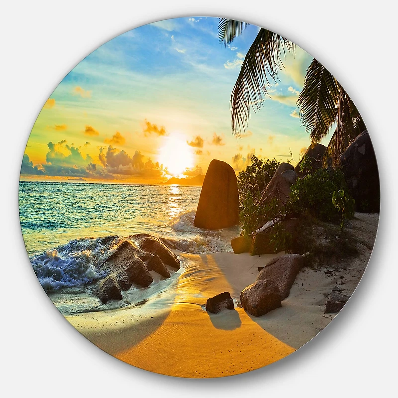 Bring Contemporary Abstraction to your home with this Orange Circle metal wall art. Available in several sizes, this Sunset in Tropical Beach Metal Artwork makes it the focal point of any room or office. Features:Style: Tropical Subject: Landscapes, Country Charm, photography Color: Orange White Gloss Coating ensures colors are extra vibrant with light reflection Unique Metal Wall Decor with Aluminum grade sheet metal 1-inch mounting frame gives the illusion of artwork floating on the wall Mounting brackets and instructions are included High quality digital images are created directly into a glossy aluminum panel, producing a stunning and captivating print in the glossy finish of the metal Water, fire, and scratch resistant HD aluminum panels Looks better than any photo paper and guaranteed to last at least 20 years Easy to clean with a microfiber cloth Colors are far superior to regular canvas art Fade resistant Water resistant UV-coated finsih Frameless Hangers on back Easy to hang See Options for available sizes