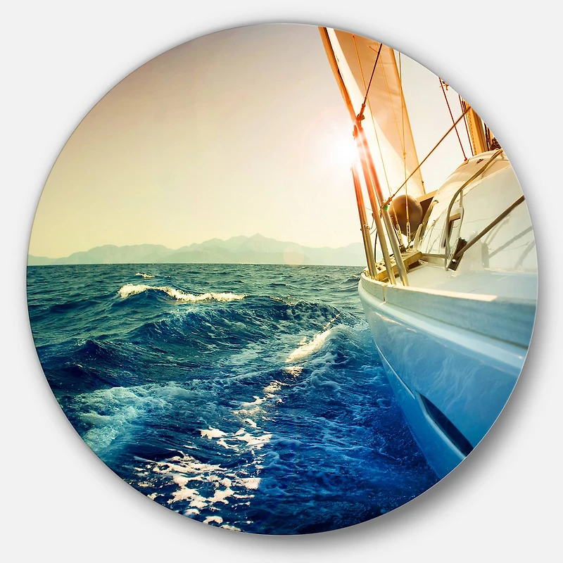 Bring Contemporary Abstraction to your home with this Blue Circle metal wall art. Available in several size, this Sepia toned Yacht Sailing in Sea Metal Artwork makes it the focal point of any room or office.Features:Style: Nautical & CoastalSubject: Sea & Shore, Nautical, LandscapesColor: BlueWhite Gloss Coating ensures colors are extra vibrant with light reflectionUnique Metal Wall Decor with Aluminum grade sheet metal1-inch mounting frame gives the illusion of artwork floating on the wallMounting brackets and instructions are includedHigh quality digital images are created directly into a glossy aluminum panel, producing a stunning and captivating print in the glossy finish of the metalWater, fire, and scratch resistant HD aluminum panelsLooks better than any photo paper and guaranteed to last at least 20 yearsEasy to clean with a microfiber clothColors are far superior to regular canvas artFade resistantWater resistantUV-coated finsihFramelessHangers on backEasy to hangAvailable in multiple sizes