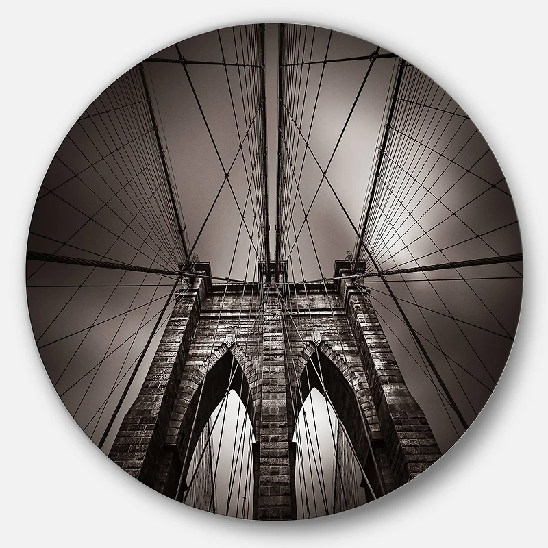 Bring Contemporary Abstraction to your home with this Grey Circle metal wall art. Available in several sizes, this Brooklyn Bridge in NYC USA Metal Artwork makes it the focal point of any room or office. Features:Style: Industrial Subject: Architecture, Cityscapes, Photography Color: Grey White Gloss Coating ensures colors are extra vibrant with light reflection Unique Metal Wall Decor with Aluminum grade sheet metal 1-inch mounting frame gives the illusion of artwork floating on the wall Mounting brackets and instructions are included High quality digital images are created directly into a glossy aluminum panel, producing a stunning and captivating print in the glossy finish of the metal Water, fire, and scratch resistant HD aluminum panels Looks better than any photo paper and guaranteed to last at least 20 years Easy to clean with a microfiber cloth Colors are far superior to regular canvas art Fade resistant Water resistant UV-coated finsih Frameless Hangers on back Easy to hang See Options for available sizes