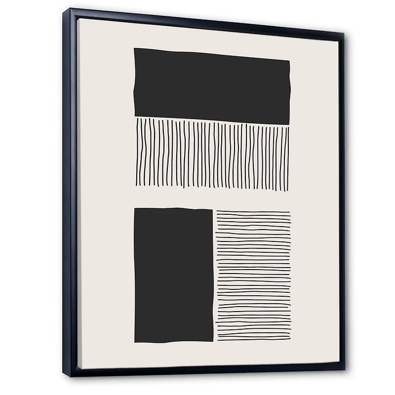 This beautiful Minimal Geometric Lines And Squares VII Framed Canvas Art is printed using the highest quality fade resistant ink on canvas. Every one of our fine art giclee canvas prints is printed on premium quality canvas, using the finest quality inks which will not fade over time. Each giclee print is stretched tightly over a 1 inch wood sub frame ensuring the canvas is taught and does not The canvas print is after insert into wood floating frame. The canvas art print is gallery-wrapped (the design continues on the sides) , giving it a real art gallery feel. All of our Framed canvas prints are carefully packaged with corner protection, fragile labeling and sturdy boxes to ensure a safe delivery. Every canvas print arrives ready to hang on the wall, with the hanging kits included. Features:Style: Modern & Contemporary Subject: Abstract, Geometric Color: Black Premium quality cotton canvas. Arrives ready to hang on the wall Easy to hang