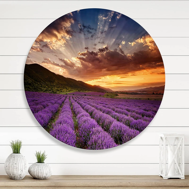 Bring Contemporary Abstraction to your home with this Purple Circle metal wall art. Available in several size, this Sunrise & Dramatic Clouds Over Lavender Field X Metal Artwork makes it the focal point of any room or office.Features:Style: Farmhouse, Subject: Landscapes, FloralColor: PurpleWhite Gloss Coating ensures colors are extra vibrant with light reflectionUnique Metal Wall Decor with Aluminum grade sheet metal1-inch mounting frame gives the illusion of artwork floating on the wallMounting brackets and instructions are includedHigh quality digital images are created directly into a glossy aluminum panel, producing a stunning and captivating print in the glossy finish of the metalWater, fire, and scratch resistant HD aluminum panelsLooks better than any photo paper and guaranteed to last at least 20 yearsEasy to clean with a microfiber clothColors are far superior to regular canvas artFade resistantWater resistantUV-coated finsihFramelessHangers on backEasy to hangAvailable in multiple sizes