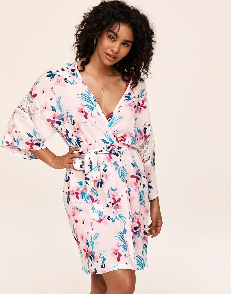 The Desirae robe is a sweet and girly number that comes in a Blissful Bouquet floral print. Woven from rayon with kimono sleeves and lace accents, this robes looks great worn open over lingerie or as a flirty dress. (Available in sizes XS-XL.)