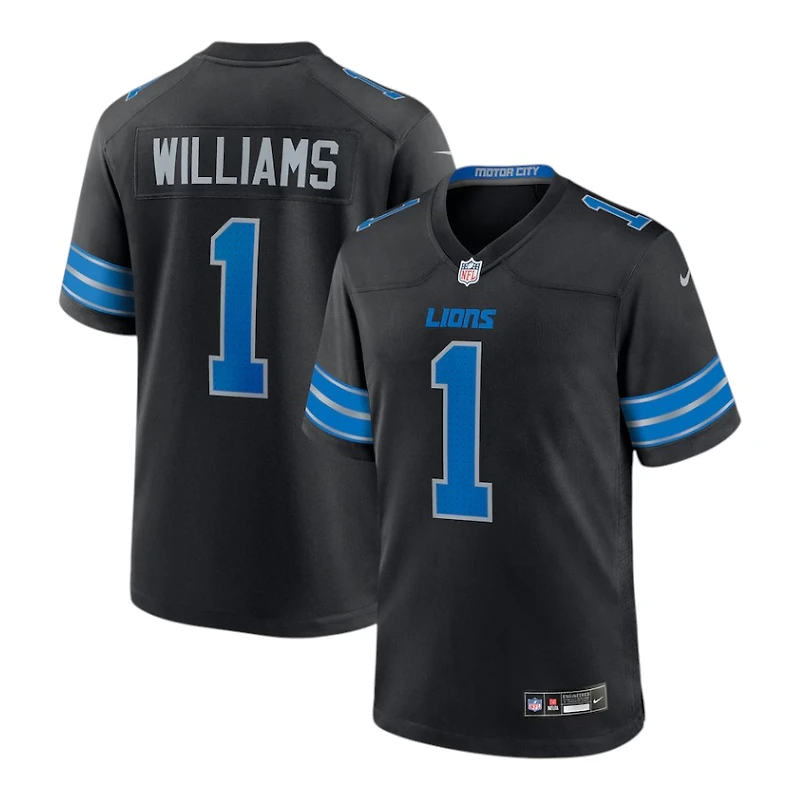 This Detroit Lions Jameson Williams Black 2nd Alternate Nike Game Jersey helps you represent your favorite team and player. Nike Game jerseys are designed for total comfort. Wear it at the stadium or in the living room on game day, either way you'll feel confident in the way you're showing pride. It has screen printed name, numbers and logos. The material is 100% polyester with a tailored design for movement. The mesh side panels provide extra breathability. This jersey is in stock and ready to ship.