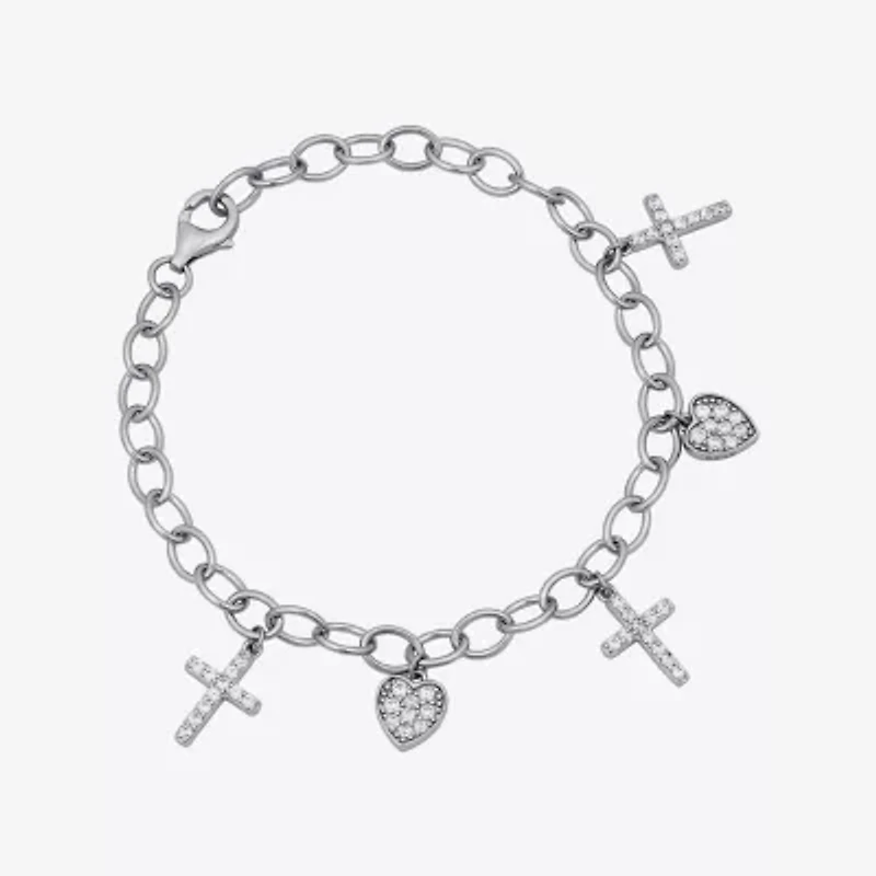 Diamonart Womens Cubic Zirconia Sterling Silver Cross Heart Charm Bracelet
