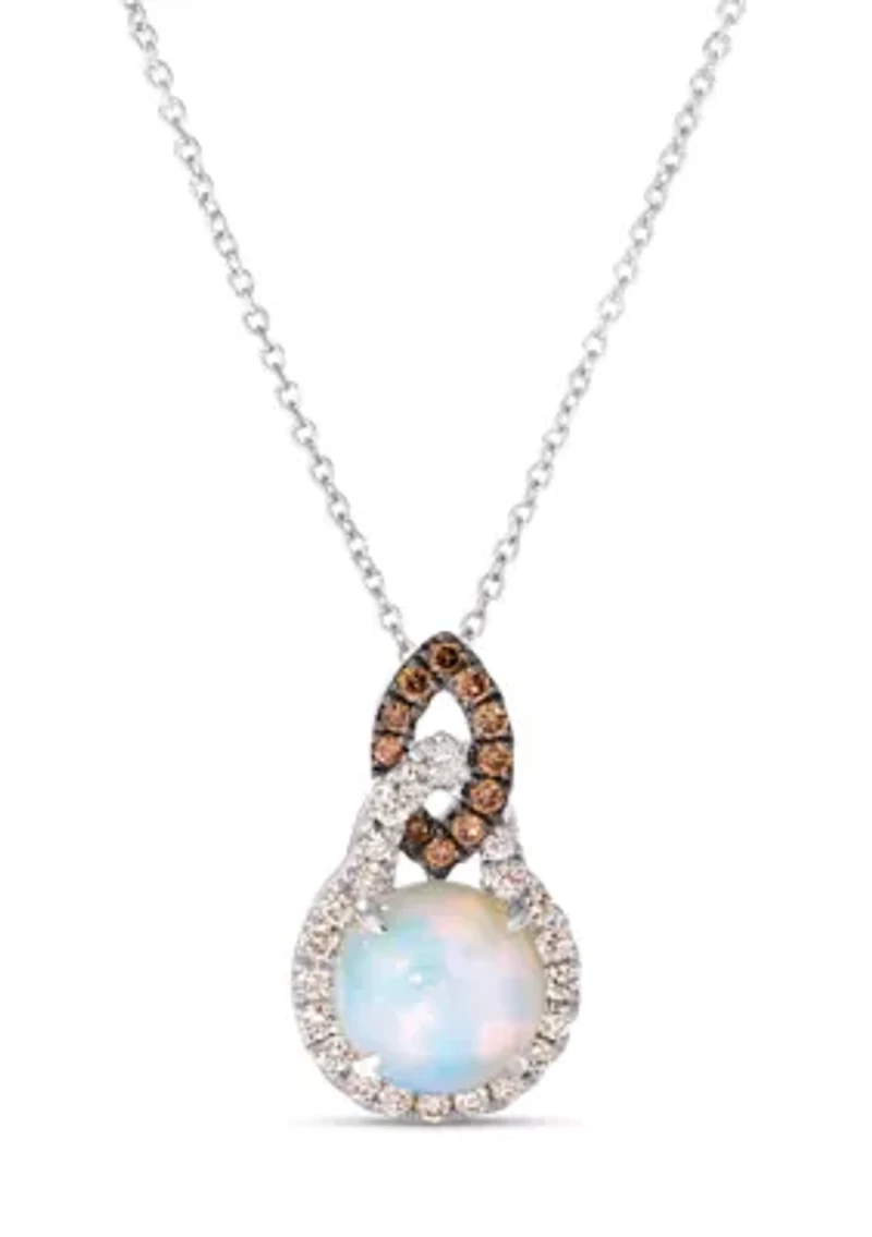 Adorn your neckline with this Le Vian® pendant, a testament to timeless elegance. Featuring a captivating opal, complemented by shimmering nude and warm brown diamonds, this piece radiates sophistication. 22 Nude Diamonds, 11 Brown Diamonds, 1 Opal lobster closure Prong setting Warranty available Imported Product Specifications 18" L 0.360 ct. t.w. Diamonds, 1 ct. t.w. Opal Material & Care White gold metal Clean with a soft cloth