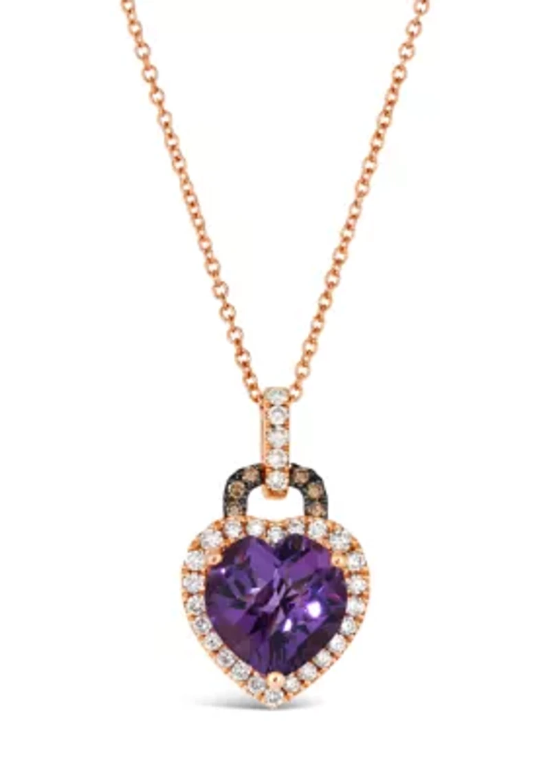 This exquisite Le Vian® pendant, crafted from radiant rose gold, showcases a captivating heart-shaped dark amethyst, complemented by a delicate dance of nude and brown diamonds. The warm hues of the gemstones and metal create a stunning contrast, perfect for adding a touch of elegance to any outfit. 29 Nude Diamonds, 6 Brown Diamonds, 1 Dark Amethyst Lobster closure Prong setting Warranty available Imported Product Specifications 18" L 1.5 ct. t.w. Diamonds, 2.05 ct. t.w. Dark Amethyst Material & Care Rose gold metal Clean with a soft cloth