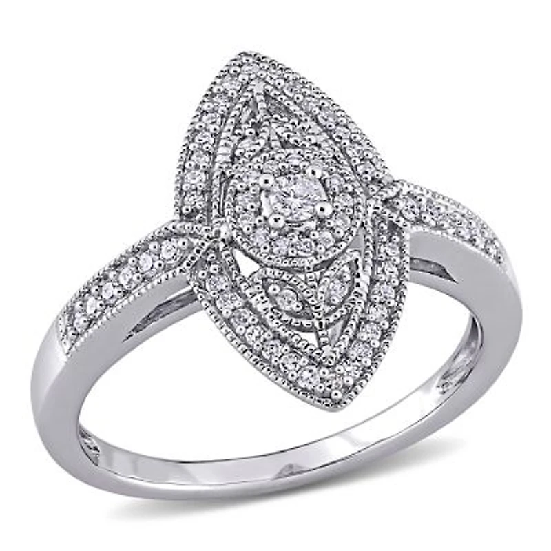 Make a graceful statement with this vintage-inspired marquise-shaped halo ring. Crafted in sterling silver, its elegant silhouette is enhanced by intricate detailing that evokes timeless charm. A shimmering halo of diamonds surrounds the center, adding a radiant brilliance that catches the light beautifully. The refined design blends classic romance with a touch of antique-inspired sophistication. A captivating piece that celebrates elegance, individuality, and enduring style. Color rating: G, H Clarity rating: I2-I3 Polished finish Prong setting Warranty available, 60 days Thailand Imported Material & Care Sterling Silver Metal, Sterling silver Clean with a soft cloth.