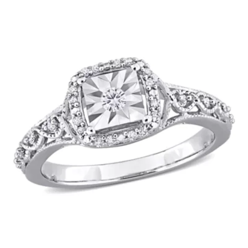 Embrace timeless elegance with this beautifully designed vintage-inspired halo ring. Crafted in sterling silver, its intricate details and graceful silhouette evoke a sense of classic charm. A sparkling halo of diamonds enhances the center, creating a radiant brilliance that catches the light from every angle. The refined design blends vintage allure with modern sophistication. A captivating piece that celebrates elegance, romance, and enduring style. Color rating: H, G Clarity rating: I2-I3 Polished finish Prong setting Warranty available, 60 days Thailand Imported Material & Care Sterling Silver Metal, Sterling silver Clean with a soft cloth.