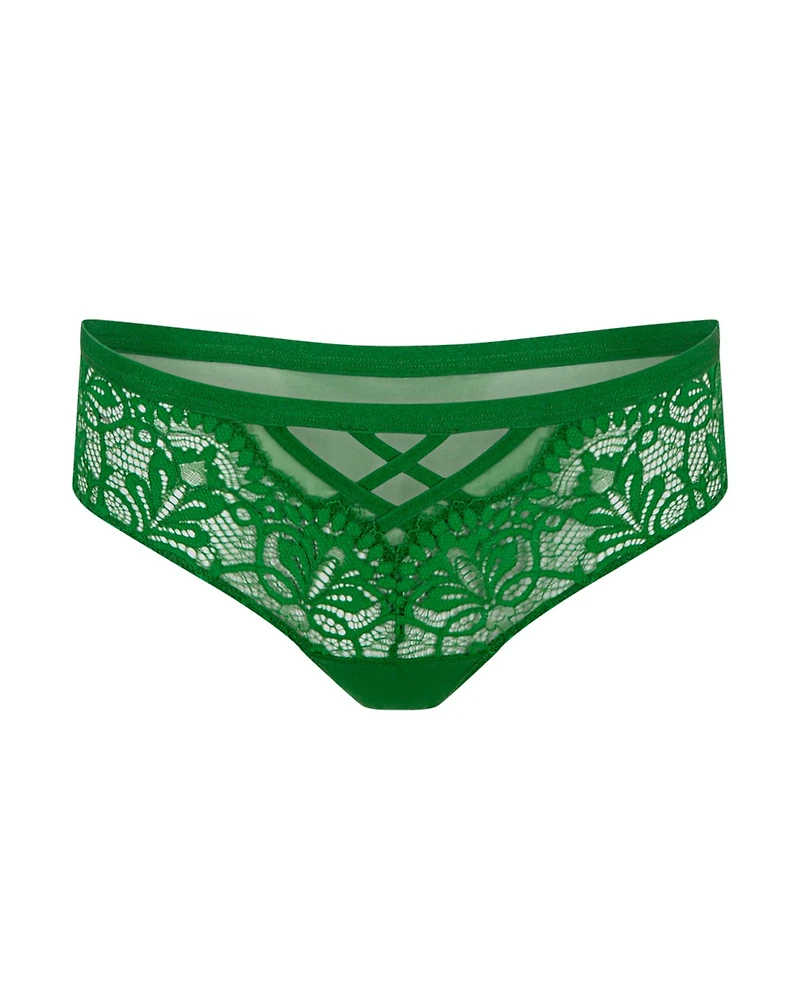 The Diara Hipster Medium Purple lace hipster is a bold-fashion statement piece. It features a Floral-lace front, Sheer mesh back, and Crossed-front elastics with keyhole details. (Available in sizes XS-XL.)