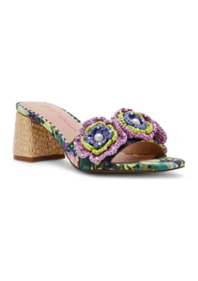 These sandals by Betsey Johnson are a must-have for any fashion-forward woman. With their chunky heels and vibrant macrame flower adornments, they'll add a touch of fun and flair to any outfit. The textured straw-wrapped heels and canvas upper provide a resort-like feel, making them perfect for warm-weather days. Slip them on and enjoy the comfort and style of these versatile sandals. Slip-on Imported Product Specifications 2.75" heel Medium width Material Lining: synthetic; Midsole: synthetic; Outsole: manmade Fabric