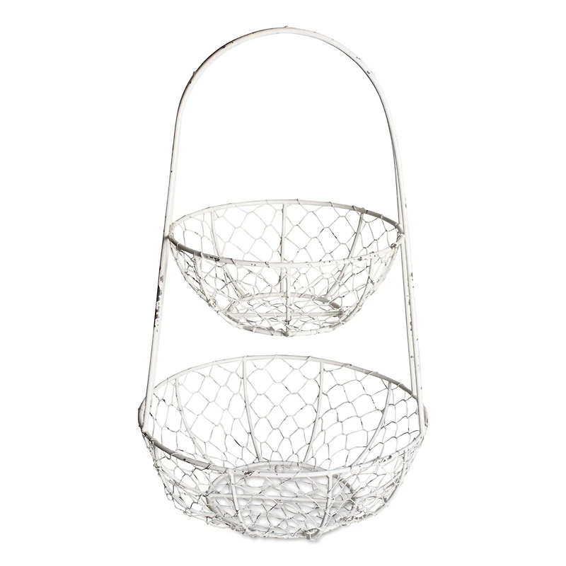 This tiered stand is made of metal with two baskets for storing fruits, vegetables or other pantry items. Get creative by mixing décor and storage by making this standing basket a centerpiece for a table stacked with juicy fruits or place in a bathroom and arrange hand towels and lotions for guests.Details:White11.81" x 11.81" x 19.7"Food safeMetal