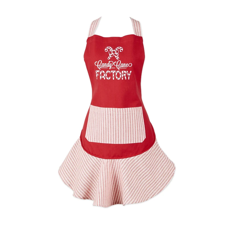 This ruffle apron measures 28.5" x 26" with generous neck and waist ties. Large front pockets for your convenience. Apron has a huge front pocket for convenience around the busy holiday season. Put on this apron and get ready for Christmas feast. The cute and flattering ruffle design makes a great gift for a Christmas party. We offer delightful home and kitchen products including throws, dishtowels, doormats, blankets, and more.Details:Candy cane factory design28.5" x 26"100% cottonMachine washableCare & Usage:Wash with cold water in gentle cycle and tumble dry lowDo not bleach or dry on high heat