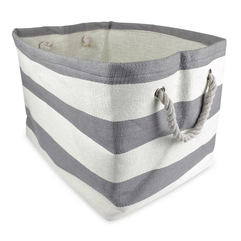 This storage bin constructed of woven paper with soft cotton rope handles knotted through grommets will hold its shape once filled and holds up to 30 pounds. These bins are available in a mix of fun striped colors and make a perfect addition to a nursery, home office, craft room or to add a splash of color to your space while also being functional. Find a place for knick knacks, children's' toys, magazines, craft supplies and more with these sturdy, everyday bins that can be tucked away when not in use.Details:Available in multiple colors17" x 15" x 12" basket sizeHolds up to 30 lb.Rope handles attachedFolds for storagePaper, cotton and metal