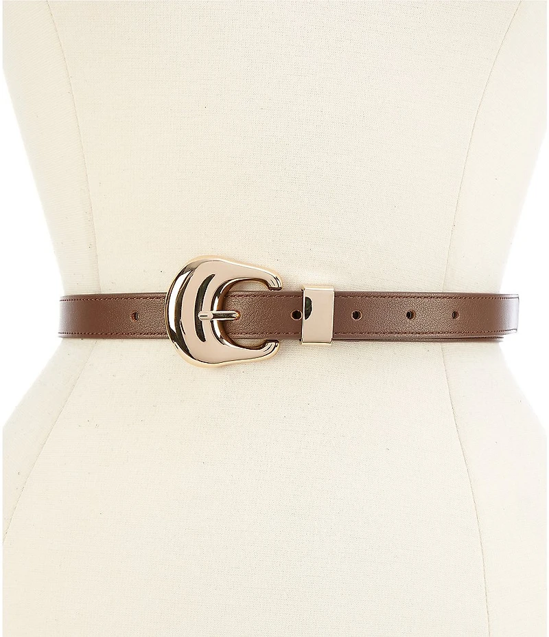 From Dillard's, this belt features:  Faux leather Buckle closure  Light gold tone hardware Approx. 0.75" W Small approx. 38" L Medium approx. 41" L Large approx. 44" L XL approx. 47" L Spot clean Imported.