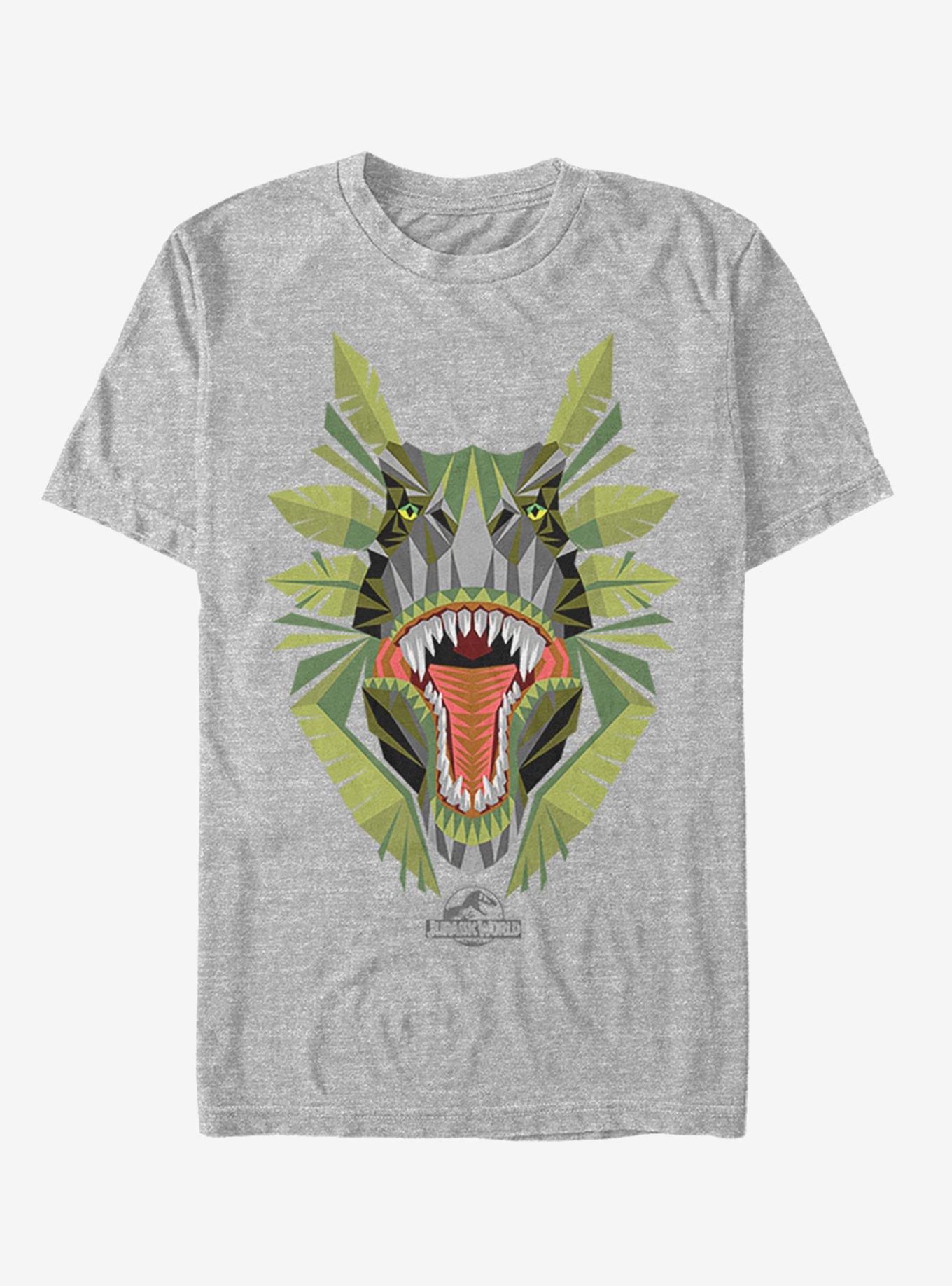 Be careful when you visit Isla Nublar, because you just might find yourself face-to-face with the Jurassic World Dinosaur Jungle Men's T-Shirt! An artistic geometric print on the front of this cool Jurassic World t-shirt features a dinosaur roaring in the jungle foliage.
