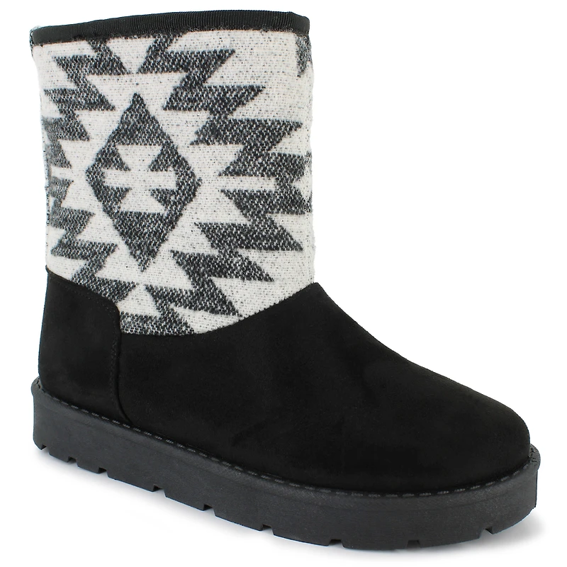 The Dirty Laundry Soaring boots are a stylish and comfortable choice for any day. They feature a convenient slip-on design with a soft faux shearling lining for warmth. The boot's faux suede upper and unique Aztec geometric pattern on the shaft create a chic look, while the lug traction outsole provides excellent grip.