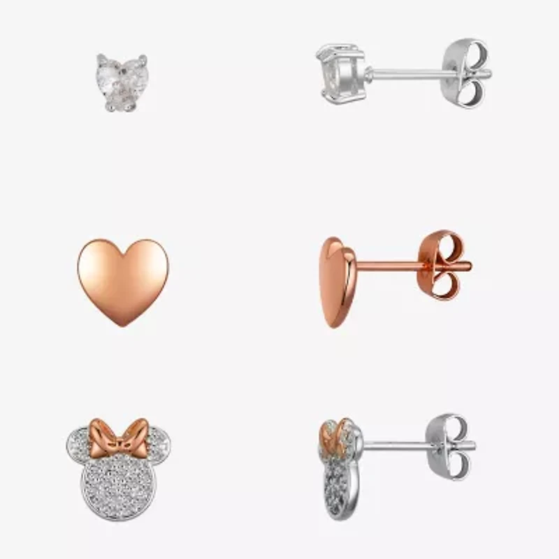 Disney Classics Stud Womens Cubic Zirconia Heart Minnie Mouse 3 Pair Earring Set