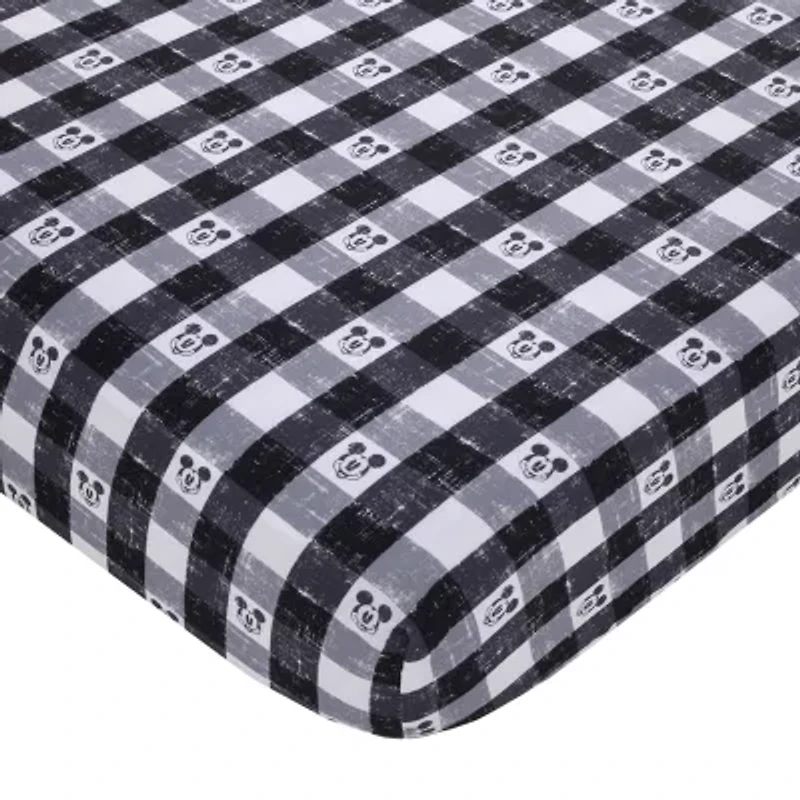 Add Disney magic to your nursery with the Mickey Mouse Plaid fitted crib sheet. Featured in a classic black, white and gray plaid pattern accented with a smiling Mickey Mouse. Includes full elastic edges for a safe and snug fit. Fits a standard size crib/toddler mattress. This product is designed to meet all your needs and more, providing both comfort and style, making it a great addition to your home or nursery.