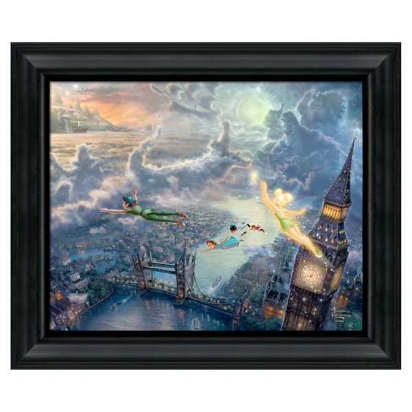 Transform your kid's room with a magical touch! This Disney Peter Pan Framed Canvas Art Print is inspired by the Disney animated film Peter Pan and is incorporated into a colorful, classic Thomas Kinkade scene. Overall dimensions Width: 26.5 in. Depth: 1.75 in. Height: 22 in. Distinctively printed on stretched canvas Wrapped in a black frame Features a design inspired by Disney's "Peter Pan" Hues of blue, green, yellow, orange, and gray Showcases a scene from Thomas Kinkade's artwork Artist: Thomas Kinkade Studios Weight: 6 lbs. Hangs from back-mounted hardware Care: Dust with a soft, dry cloth. This item is available at Kirklands.com only, not available in stores. Please note: this item cannot be shipped to APO/FPO addresses.