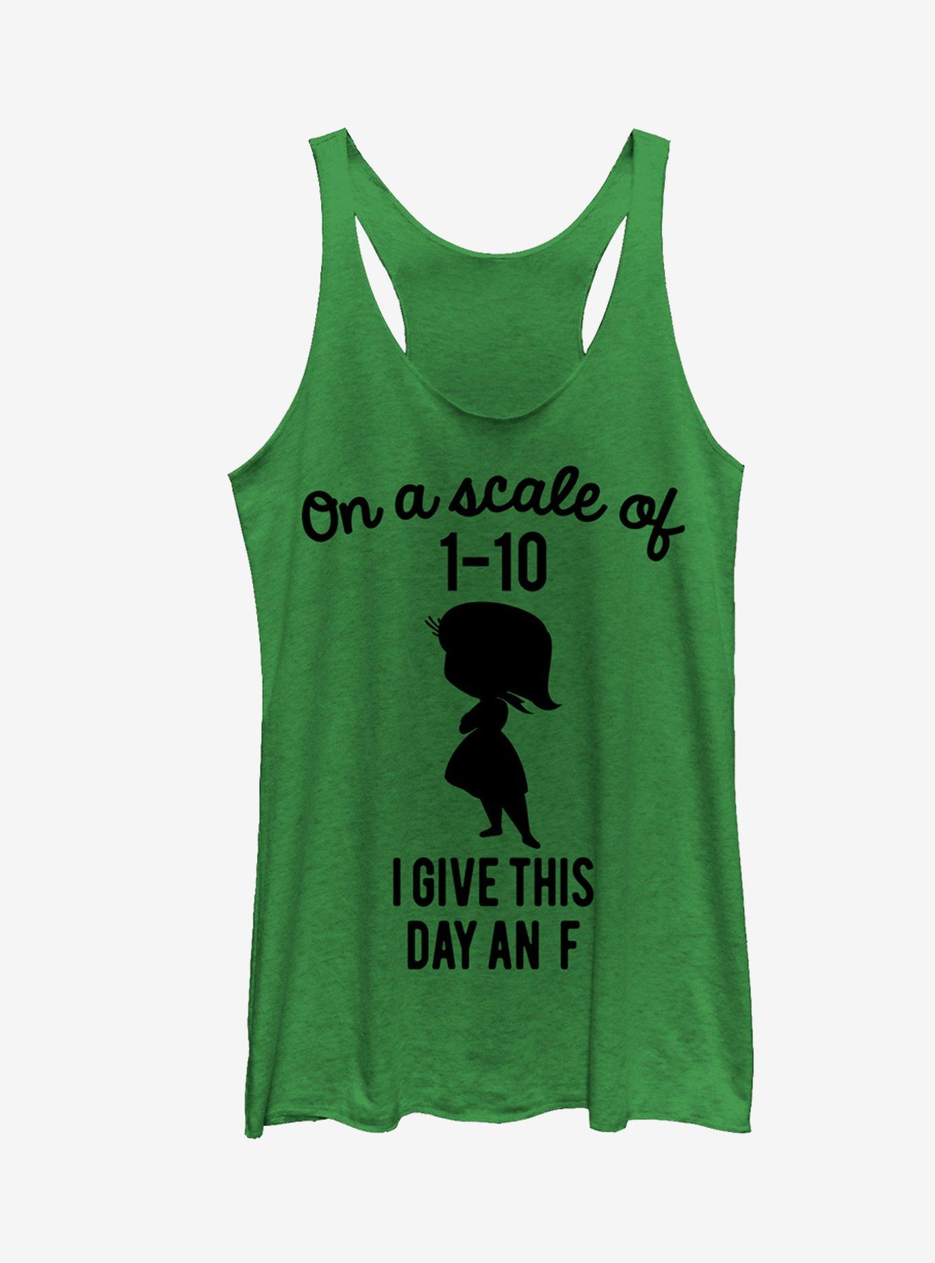 Need something to help you avoid broccoli? Team up with the Inside Out Disgust I Give This Day an F Heather Green Racerback Tank Top! A black print on the front of this cute green Inside Out shirt reads "On a Scale of 1-10 I Give This Day an F" next to Disgust's silhouette. 50% Polyester, 25% Cotton, 25% Rayon.