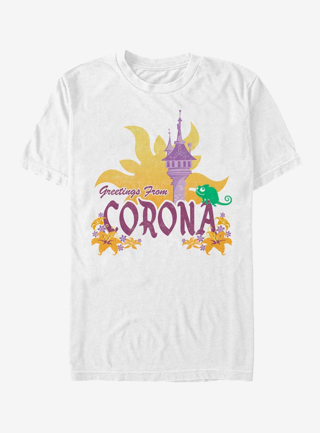 The island kingdom beckons. This extra soft, lightweight tee -- inspired by Disney's Tangled -- has "Greetings From Corona" verbiage along with images of Rapunzel's tower, the sun, flowers and Pascal the chameleon.