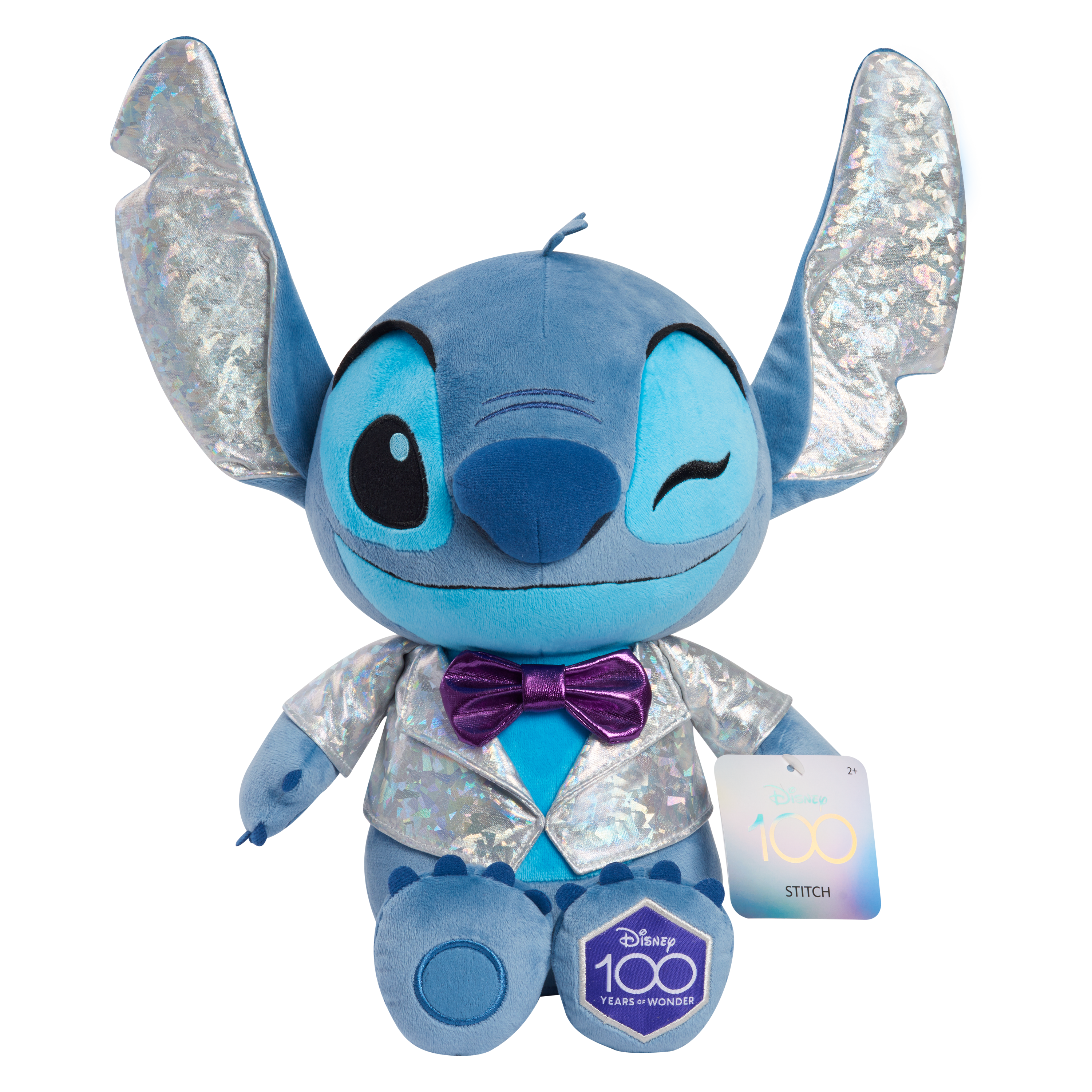 Celebrate a lifetime of memories with the Disney100 Years of Wonder Stitch Large Plush. This collection honors a century of magical storytelling by the Walt Disney Company. Stitch arrives well prepared for the celebration in his stylish, platinum best from the top of his silvery ears to his special Disney100 Years of Wonder foot badge. This 17-inch tall, cuddly plushie comes dressed in his shimmery purple bowtie platinum evening jacket and features classic embroidered detailing. Stitch, along with the Minnie Mouse, Jack Skellington, and Mickey Mouse Disney100 Years of Wonder Large Plushies, make a fantastic addition to any movie fan’s collection (each sold separately). These once-in-a-lifetime keepsakes are ideal for fans and kids ages 2 years and up.