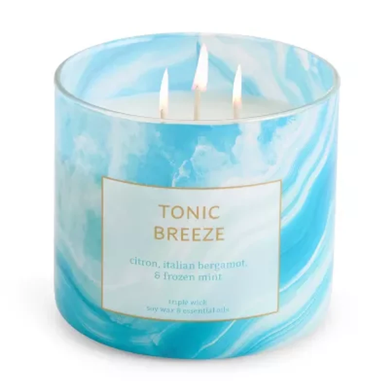This Distant Lands Tonic Breeze 3-wick candle will fill your space with a delightful citrus essence, featuring notes of citron, Italian bergamot and frozen mint. It's made from soy wax and essential oils and comes in a beautifully decorated jar that adds to the ambiance.