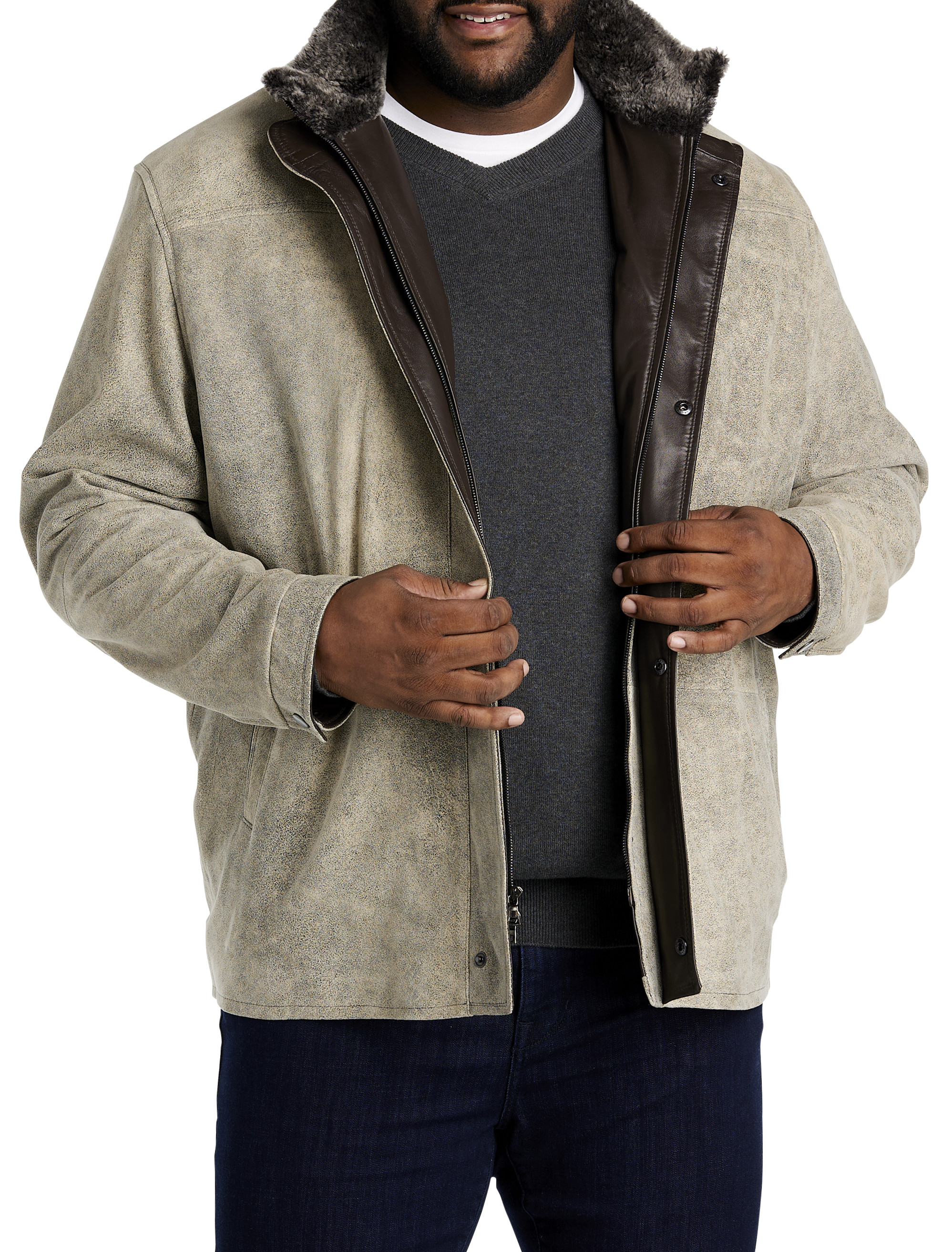 Comfort and style combine in this versatile jacket that belongs in every man's wardrobe. Made right here in the USA, production at Remy Leather is a thorough, exacting endeavor. There is an unparalleled craftsmanship, handwork and attention to detail by their professional, highly skilled staff, with each step ensuring the quality of the finished product. Here, the English domestic lambskin, tanned in Italy, is finished on the suede side. The base skin is double-dyed, with a darker second dye applied over the lighter colored base layer. Then it's buffed by hand to achieve the unique distressed appearance. It has a sophisticated double-collar design with a shearling fur collar. A bit longer than traditional jackets, it hits below the waistline and has a hidden zip-front placket and snap-button closures for a modern look. It's the perfect top layer – worn casual with jeans or elevated with dress pants – and a wise investment for years to come.