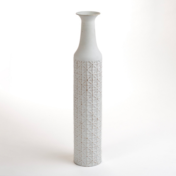 Flaunting geometric patterns and a tall, tapered shape, our Distressed White Metal Textured Floor Vase will make a chic addition to your fireplace display. Vase measures 30H x 5 in. in diameter Crafted of metal Cylinder shape with tapered neck Distressed white finish Textured geometric pattern Weight: 1.76 lbs. For decorative use only Care: Dust with a soft, dry cloth. Contact your local Kirkland’s store for availability. Quantities and selection may vary by location.