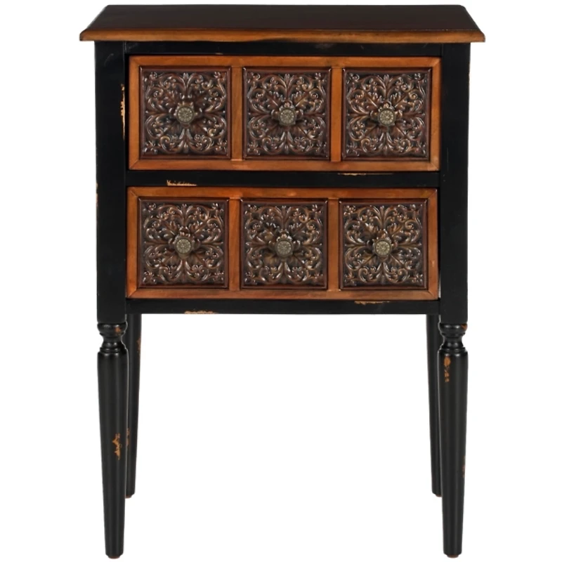 The Distressed Wood Cindie 2-Drawer Accent Table makes any room feel welcoming! Its carefully crafted drawer facings are inspired by architectural Spanish carvings while its two-toned finish offers a touch of Tuscan warmth. Accent table measures 22.5W x 14D x 30.1H in. Crafted of birch wood and iron Distressed two-tone brown finish Features two (2) drawers Ornate carved drawer fronts Brass iron finish Weight: 20 lbs. Weight capacity: 100 lbs. Assembly required; see Info & Guides in the drop down below to view or print assembly instructions Not intended for commercial use Care: Wipe with a soft, dry cloth. This item is available at Kirklands.com only, not available in stores. Please note: this item cannot be shipped to APO/FPO addresses.