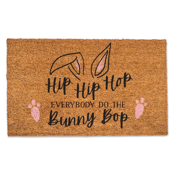 Welcome every-bunny into your home this spring with this Do the Bunny Bop Doormat. Its fun, cheery design will put the cutest Easter touch on your entryway! Doormat measures 30L x 18H in. Crafted of coir with a vinyl back Features the phrase "Hip hip hop everybody do the bunny hop" with bunny ears and footprints Hues of brown, black, and pink Water and mildew resistant Safe for outdoor use Designed and printed in the USA Care: Shake well periodically to prevent dirt build up. To maintain vivid colors, avoid direct exposure to sunlight. This item is available at Kirklands.com only, not available in stores. Please note: this item cannot be shipped to APO/FPO addresses.