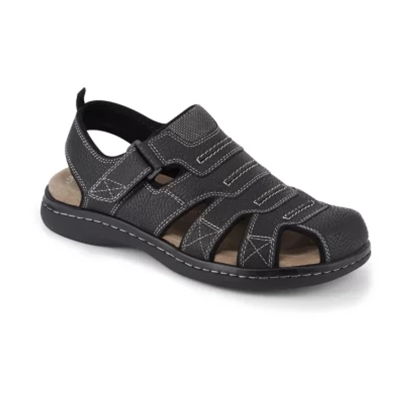 This pair of strap sandals for men sandals from Dockers have a round and flat heel. They feature an EVA cushioned insole, a hook-and-loop strap across the front and back for an adjustable fit and a rubber sole for added comfort.
