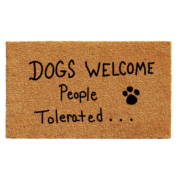 Bring a fun and cute touch to your front door with this Dogs Welcome Coir Doormat! This doormat is perfect for dog lovers. Like-minded friends and family will get a kick out of it, as well! Mat measures 36L x 24W x 0.6H in. Crafted of coir with a non-slip backing Tan background finish Reads, "Dogs welcome people tolerated..." with a paw print Hues of tan and black Durable coir scrapes shoes clean All-season, colorfast, and weather tolerant Care: Shake mat regularly to minimize dirt build-up. To prolong the life of mat, use in dry sheltered area. Avoid the mat from getting wet. Natural coir when wet may discolor surrounding areas. This item is available at Kirklands.com only, not available in stores. Please note: this item cannot be shipped to APO/FPO addresses.