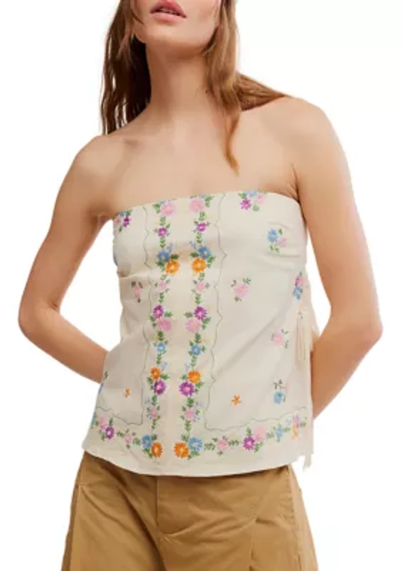 Stunning embroidery takes this sweet cotton tube top from Free People to the next level. Shirred back Slits at side seams with tie details Flowy fit Imported Product Specifications 14" L Material & Care 100% cotton Machine washable
