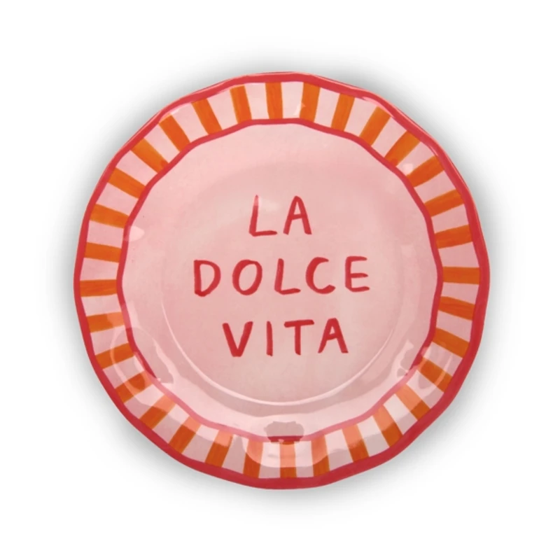 Our Dolce Vita Melamine Appetizer Plate will add a little something sweet to your tablescape! Host an Italian summer-inspired gathering with this charming dinnerware. Plate measures 6 in. in diameter Crafted of melamine Features "La Dolce Vita: Striped border Hues of pink, coral, and orange Food safe Care: Dishwasher safe for top rack only. Not microwave or oven safe. Contact your local Kirkland's store for availability. Quantities and selection may vary by location.