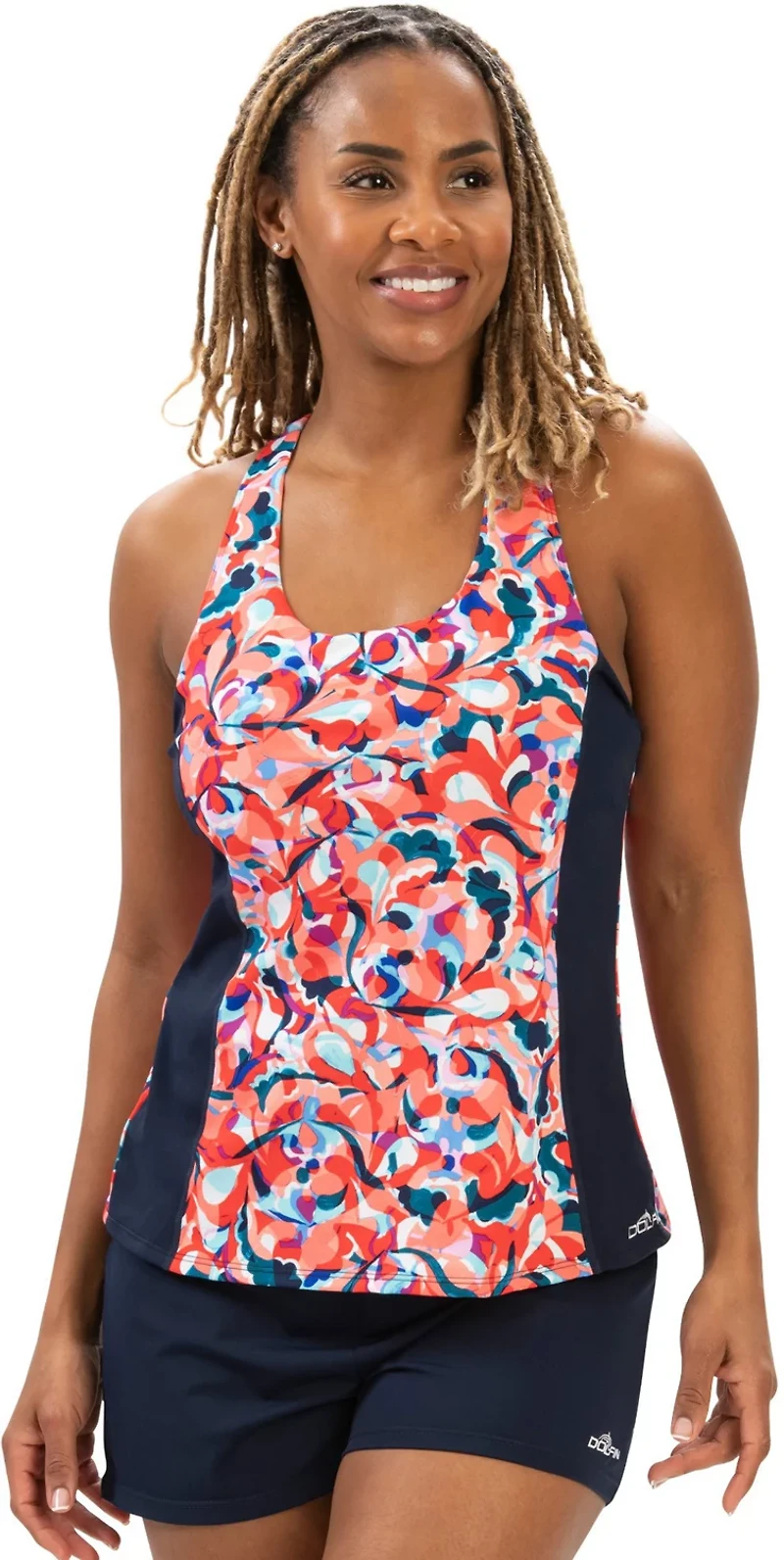 Enjoy time in the water in comfort and style whenever you sport the Dolfin Women's Aquashape Print Twist Back Tankini Swim Top. The 100% polyester fabric delivers a lightweight, stretchy fit and the built-in shelf bra with removable cups provides a supportive fit. The UPF 50+ Sun protection blocks harsh sun rays for safety, while the twist back design and graphic print adds a sleek, stylish appearance to your look.
