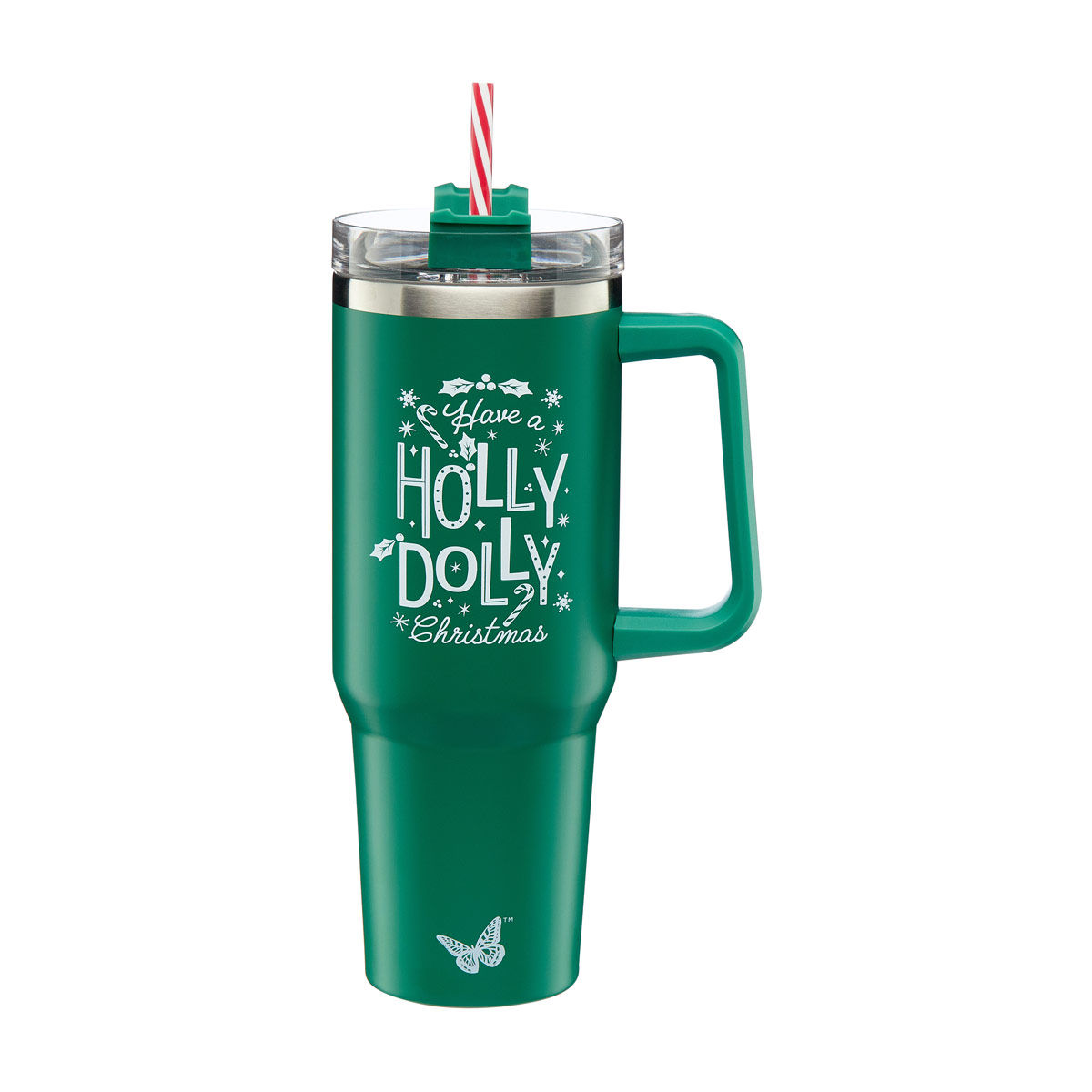 2. A vibrant red or green tumbler with the cheerful message "Have a Holly Dolly Christmas," featuring playful holiday motifs like holly leaves and candy canes, ideal for spreading holiday cheer.