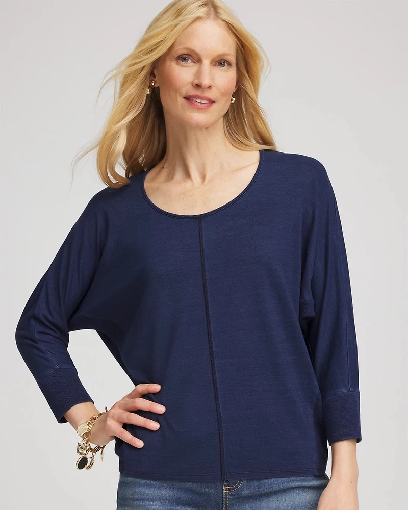 - Relaxed-fit tee with 3/4 dolman sleeves and soft scoop neck.
