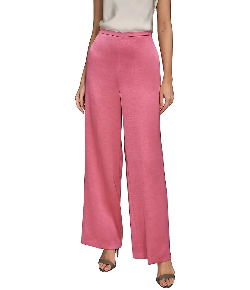 From Donna Karan, these pants feature: Satin fabrication  Wide leg Flat front Side zip closure Pull-on construction Approx. 32.5" inseam; 16.25" back rise; 12" front rise Polyester Machine wash cold/dry flat Imported.