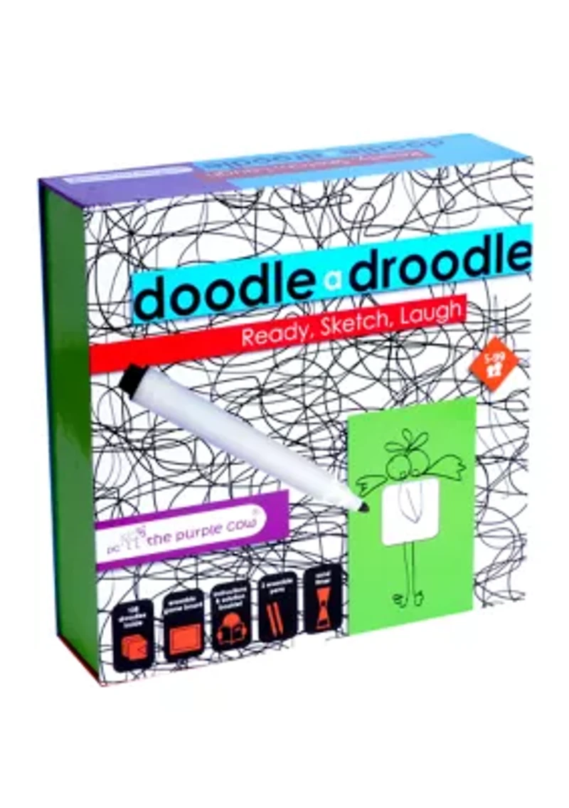 Ready, Sketch, Laugh! The Purple Cow brings the Droodles back to life with a twist! Droodles are nonsense amusing cartoons that were originally created in the early 1950s. The name "droodle" signifies a mix between a "doodle" (a sketch) and a "riddle". In this entertaining droodle game, players need to think creatively and sketch their interpretation of the droodle. If they did a good job in sketching - they win points. A good laugh is guaranteed! This game assists in developing fine motor skills, creative and "out of the box" thinking, as well as sharpening one's sense of humor! Recommended for 1 to 10 players, ages 5 and up. Package dimensions: 9.88 in x 9.88 in x 2.75 in Includes 108 Droodles, Erasable Game Board, 2 Erasable Pens, Sand Timer, Instructions & Solution Booklet. WARNING: CHOKING HAZARD - Small parts. Not for children under 3 years of age. Imported Material & Care Plastic Spot clean only