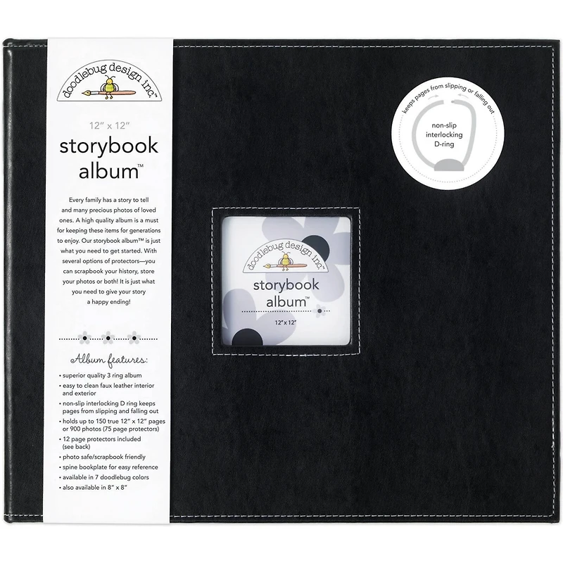 This 3-ring album with non-slip interlocking D-ring bindings is accented with faux leather inside and out. This album features a window in the front cover and 12 page protectors, 10 true 12" x 12" pockets, 1 photo-recipe card protector with 6 pockets and 1 combo protector with 4 pockets.Details:Available in multiple colors12" x 12"3-ring album Faux leather and plaster