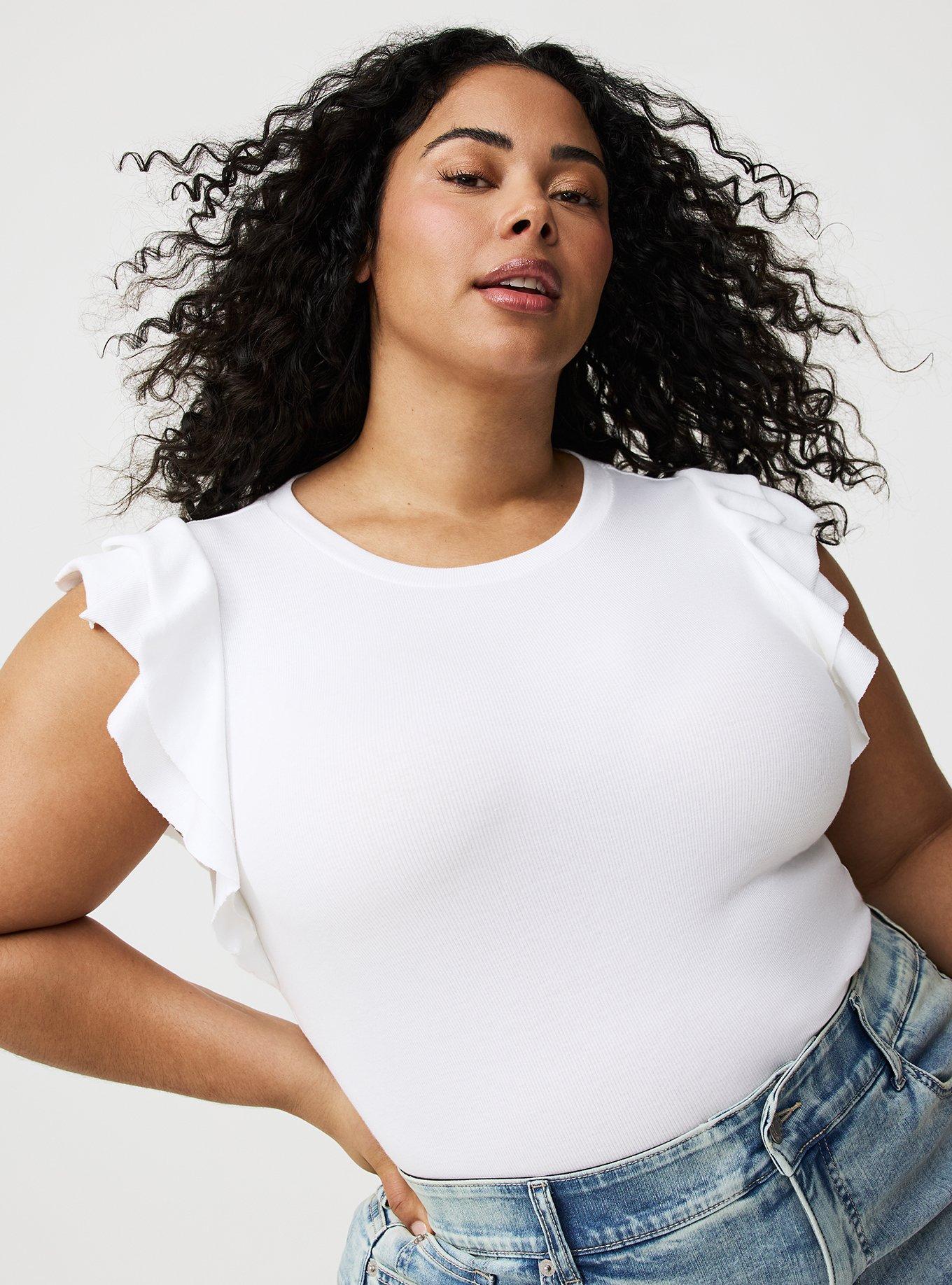 FIT Slim fit: Fitted throughout for a sleek look that’s never clingy. Measures 28"" from shoulder (size 2). MATERIALS + CARE Rib knit fabric. 95% cotton, 5% spandex. Machine wash cold. Tumble dry low. Imported. DETAILS Crew neckline. Double layered flutter sleeves.