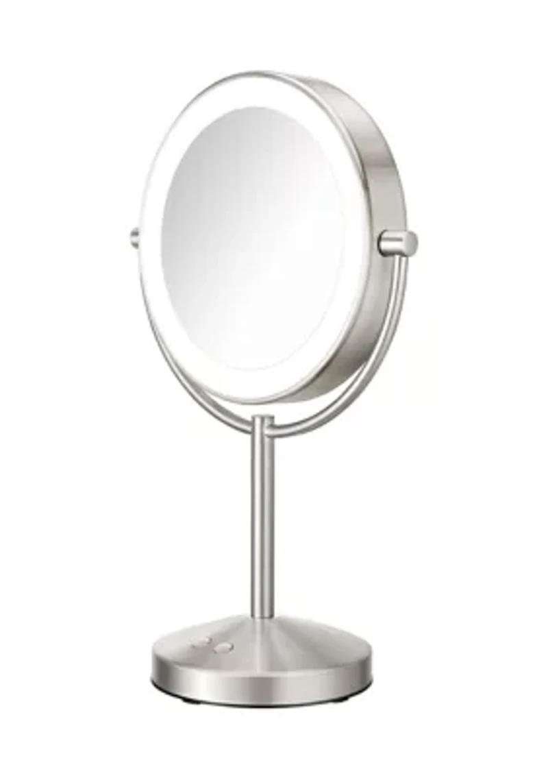 Lifetime LED Lighting: Experience clear, energy-efficient illumination with light bulbs that never need to be replaced. 3 Light Settings: Select low, medium, or high at the touch of a button and reveal yourself in soft, even lighting so you can easily achieve a flawless look for any occasion. 3 Light Modes: Choose from office, home, and day for just the right tone, depending on where and when you use the mirror. 1x/10x Magnification: Double-sided design lets you switch seamlessly from 1x magnification for full view and 10x magnification for close-up work. 360° Rotation: The mirror head swivels for custom viewing at any angle. Satin Nickel Finish: Stylishly crafted to add an on-trend touch to any countertop. 8.5-inch Diameter Round Mirror: Large surface gives you a full view and lets you zero in on all the details. 1-Year Limited Warranty: Use your mirror with confidence. Durably and expertly designed, this beauty essential is covered under warranty for a full year. Corded Convenience: Just plug in for full, uninterrupted power—no batteries to replace! Imported